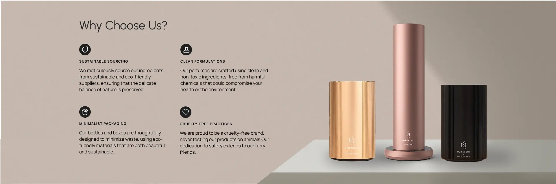 At Quiescent, we believe scent has the power to create lasting memories. That’s why we collaborate with companies to create luxurious, personalized gifts. From client appreciation and corporate events to employee recognition, our bespoke fragrances elevate your brand and leave a lasting impression.
